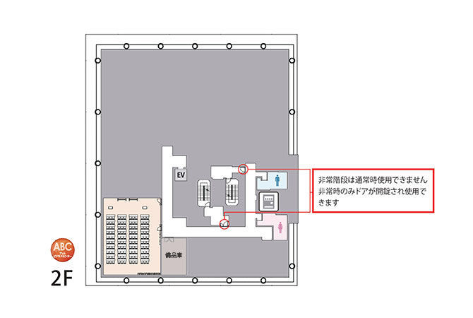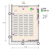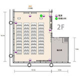 テーブル(40)、椅子(120)、演台(1)、司会台(1)、ホワイトボード(2)、コートハンガー(2)、傘立て(2)、案内板(1)、個別空調、インターネット回線(有線&無線LAN)、ゴミ箱、ブラインド |