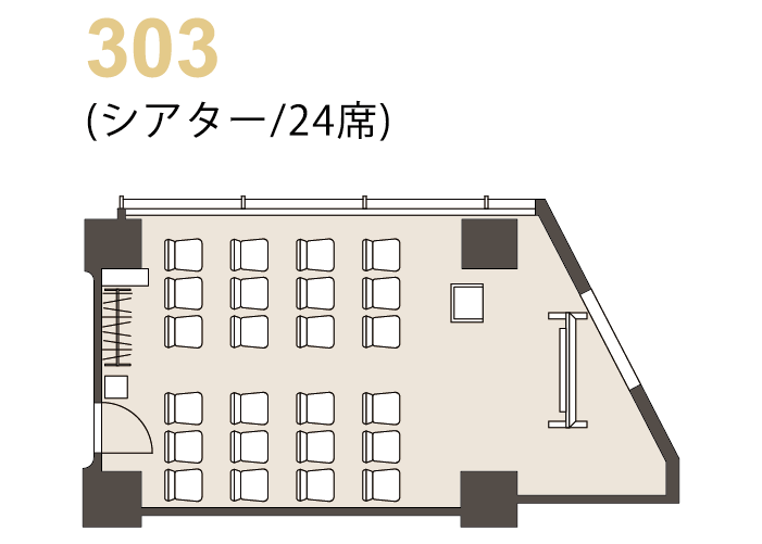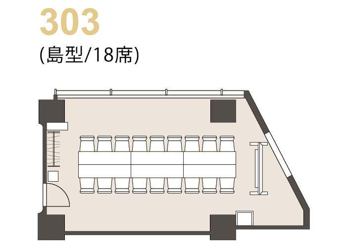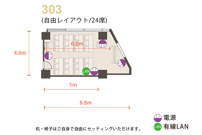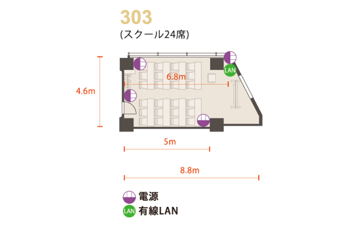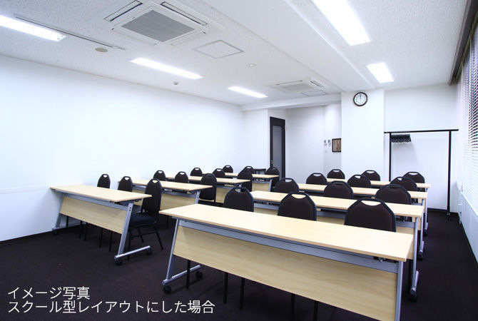 テーブル(3名掛け×8台)、椅子(24脚)、ホワイトボード(1台)、演台ハンガーラック(1台)、ハンガー、傘立て、時計(2個)、演台、多目的台、インターネット回線(有線&無線LAN)、延長コード(5m×3本)、LANケーブル(5m×1本) |