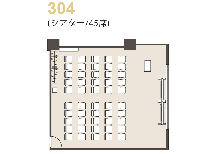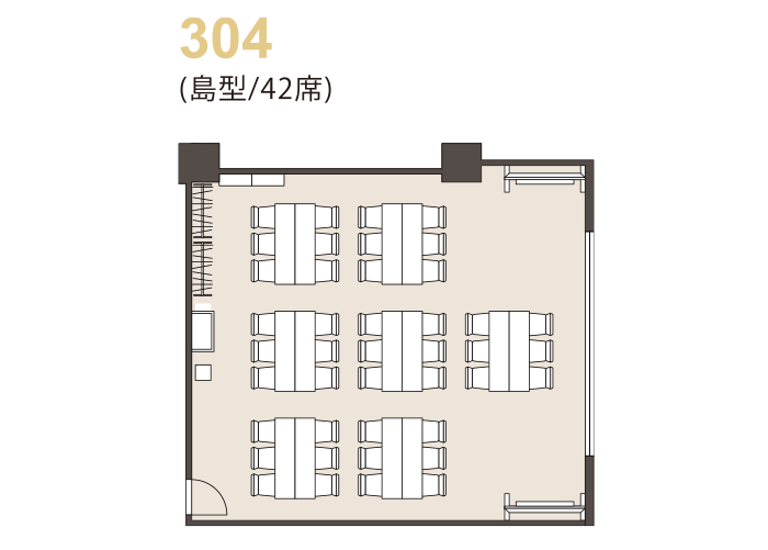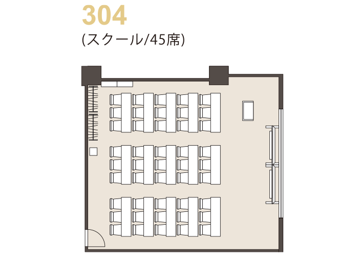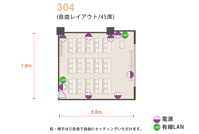 テーブル(3名掛け×15台)、椅子(45脚)、ホワイトボード(2台)、ハンガーラック(2台)、ハンガー、傘立て、時計(2個)、演台、多目的台、インターネット回線(有線&無線LAN)、延長コード(5m×5本)、LANケーブル(5m×1本) |