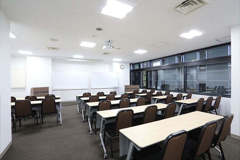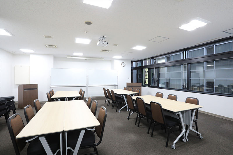 テーブル(3名掛け×11台)、椅子(33脚)、ホワイトボード(2台)、ハンガーラック(1台)、ハンガー、傘立て、演台、多目的台、時計(2個)、インターネット回線(有線&無線LAN)、延長コード(5m×3本)、LANケーブル(5m×1本)、HDMIケーブル(5m×1本) |