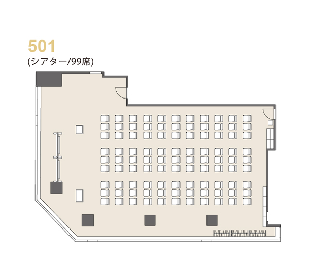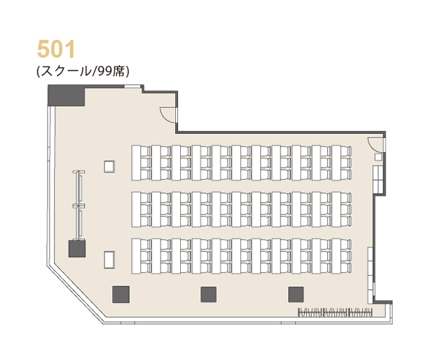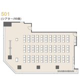 テーブル(3名掛け×33台)、椅子(99脚)、ホワイトボード(2台)、ハンガーラック(3台)、ハンガー、傘立て、演台、司会台、多目的台、時計(2個)、インターネット回線(有線&無線LAN)、延長コード(5m×5本)、LANケーブル(5m×1本)、HDMIケーブル(5m×1本) |