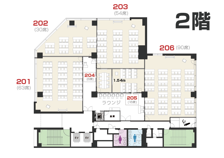 2F〜4Fまで様々なバリエーションのお部屋をご用意。使い勝手のいい90名以上の大部屋をなんと3部屋もご用意しています!各フロアには重厚感と安心感のある待合ラウンジを完備し、常駐スタッフがお出迎え。